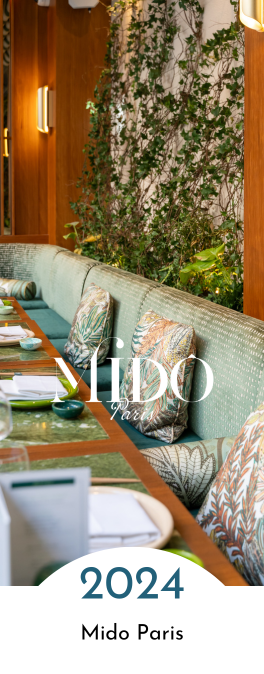 Midô débute les voyages et s’installe à Paris. A deux pas de l’Arc de Triomphe, derrière l’animation des Champs-Elysées, se cache un refuge paisible. Un lieu unique à l’abri du tumulte et des regards, niché dans un patio verdoyant qui se transforme au fil des saisons : terrasse ensoleillée en été, jardin d’hiver chauffé quand le froid se fait sentir. Midô Paris propose une expérience culinaire singulière dans un cadre élégant et confidentiel.
